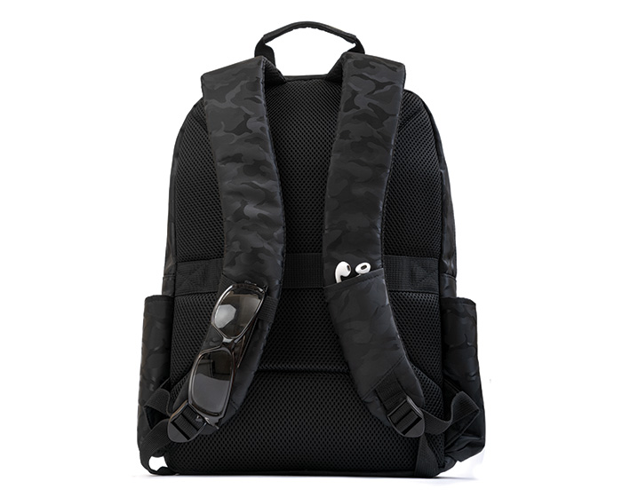 Mochila tipo backpack porta laptop de 15.6 pulgadas con diseño de camuflaje además de dos compartimentos y bolsas laterales. Interior acolchado con compartimentos para accesorios. Correas acolchadas ajustables con porta lentes y bolsa para accesorios. Banda para sujetarse sobre maleta de viaje y asa superior.