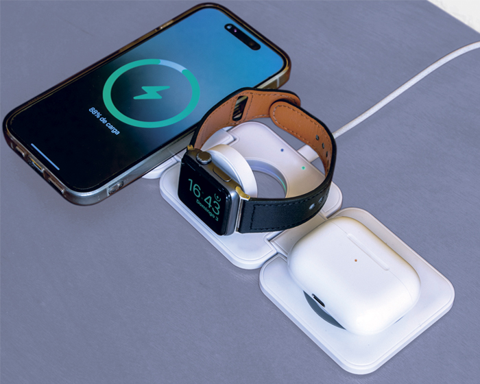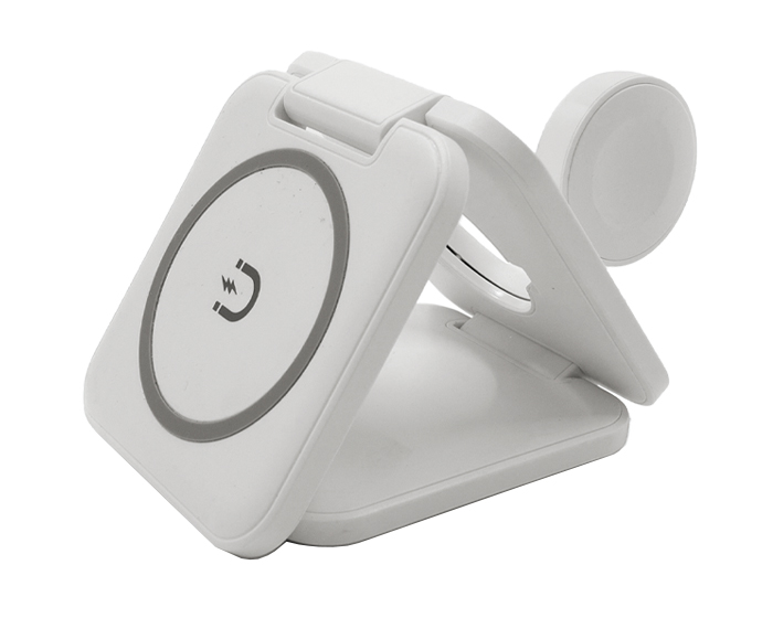 Multicargador inalámbrico de carga rápida plegable con imán 3 en 1. Incluye: compartimento de carga para celular, para reloj inteligente (carga solo dispositivos I WATCH) y para audífonos. Cuenta con 2 indicadores LED de carga. Entrada de carga tipo C (incluye cable de carga). Compatible con dispositivos iOS. Presentación: caja de regalo a color. (Verifique la compatibilidad con sus dispositivos móviles).