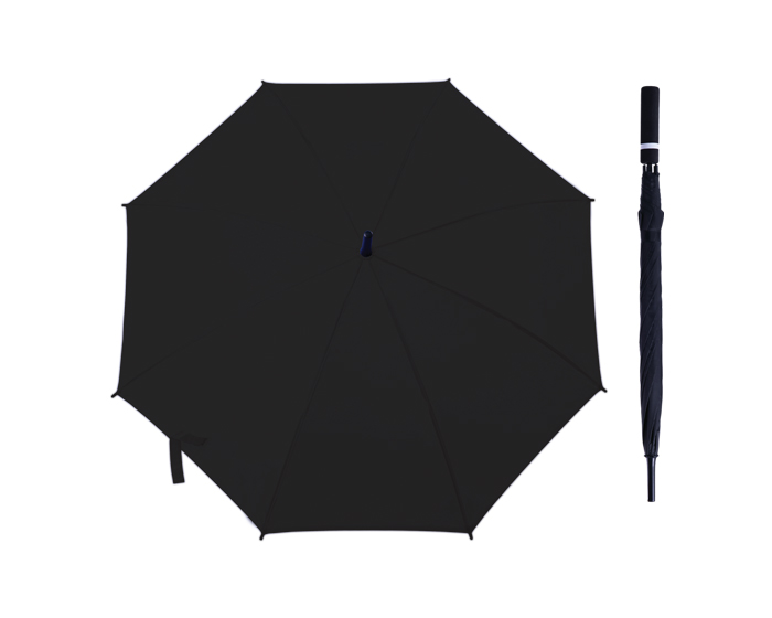 Paraguas con botón de apertura automático, varillas y eje de metal. Cuenta con mango de EVA con detalle de color. 8 gajos.