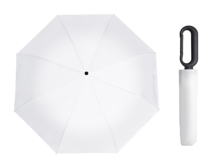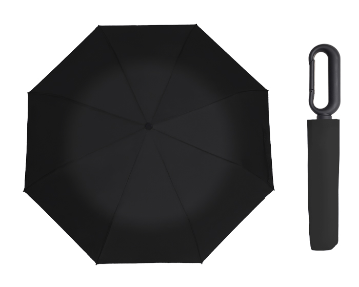 Paraguas de bolsillo de 8 gajos, con botón de sistema de apertura manual, eje de metal y varillas de fibra de vidrio, mango de plástico con gancho para colgar. Incluye funda individual.