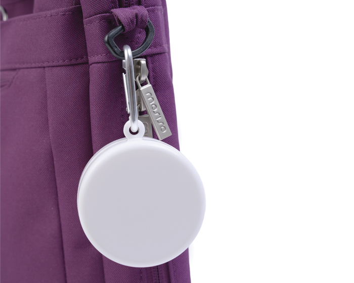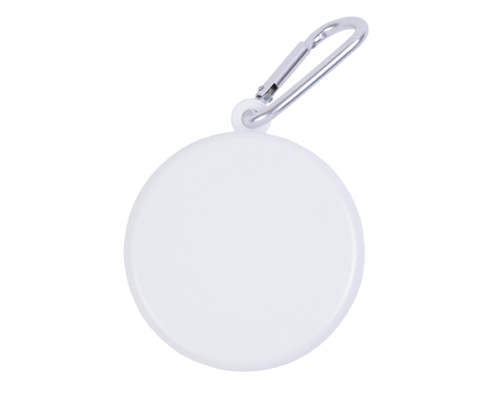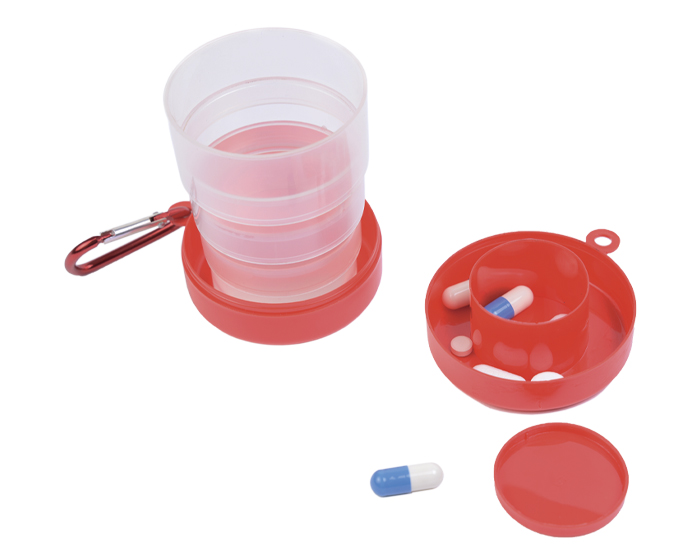 Vaso plegable con estuche que funciona como pastillero que incluye tapa y argolla metálica para transportar.