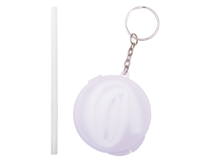 Popote flexible con cuerpo de color. Cuenta con estuche traslúcido y arillo metálico de llavero. Medida de popote 25 cm.