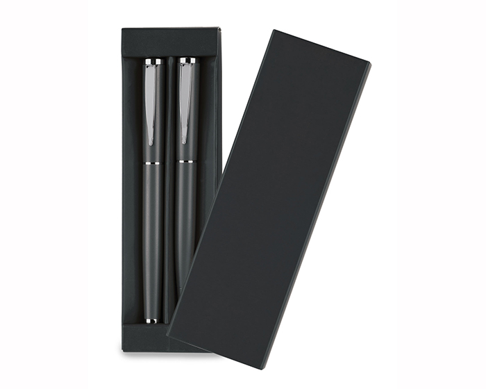 Set de bolígrafos metálicos de tinta negra: un bolígrafo de punto fino tipo roller con tapa y un bolígrafo con mecanismo retráctil. Presentación: caja color negro.