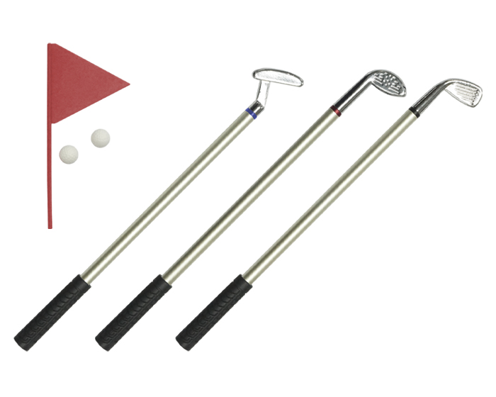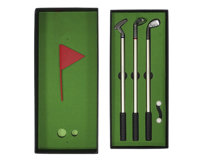 Exclusivo juego de escritorio para los amantes del golf, consiste en set de 3 bolígrafos metálicos con forma de los distintos tipos de palos de golf, dos mini pelotas de golf y el interior del estuche funge como campo de golf. Presentación: Caja negra.