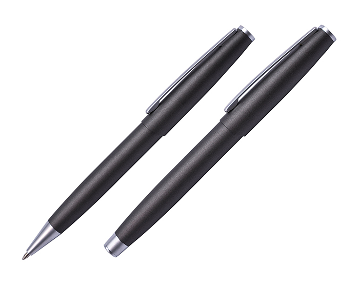 Set de bolígrafos metalicos. Un bolígrafo de punto fino tipo roller con tapa y otro bolígrafo con mecanismo retráctil con clip metálico. Presentación: caja en color negro.
