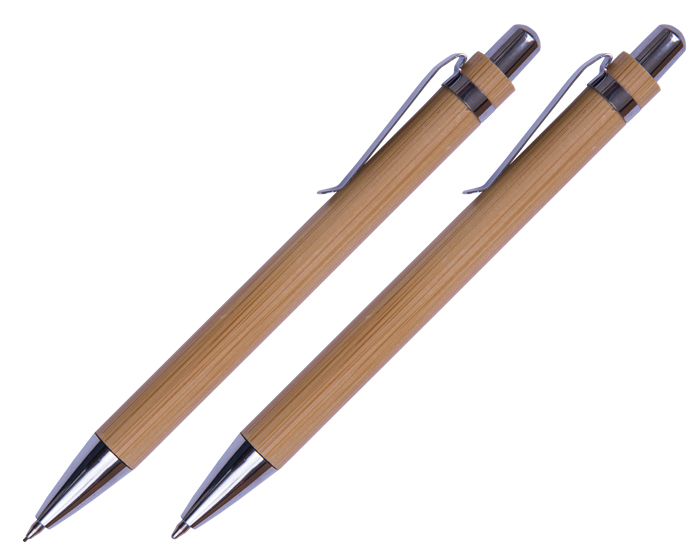 Set de bolígrafo y lapicero de bambú con clip metálico. Mecanismo de click. Incluye estuche.