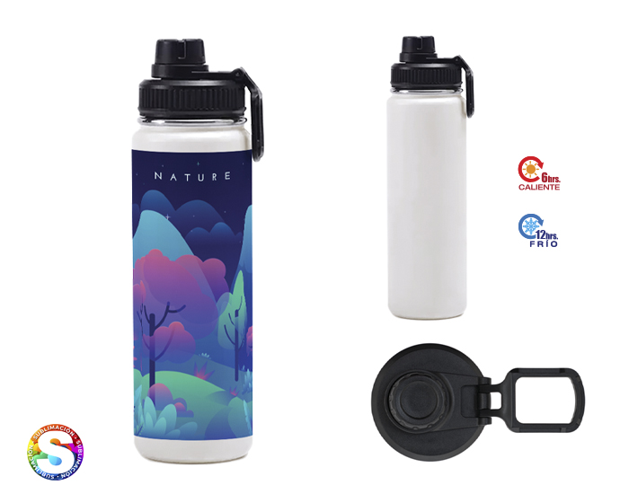 Termo de doble pared para sublimación insulado al alto vacío. Mantiene las bebidas frías por 12 hrs. y calientes por 6 hrs. Tapa de rosca con boquilla y asa para sujetarlo fácilmente. CAP. 600 ml. (20 OZ). Presentación: Caja en color negro.