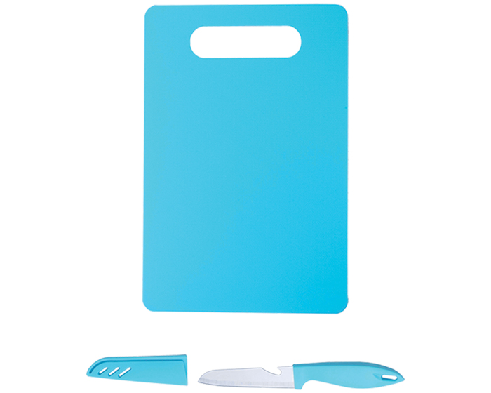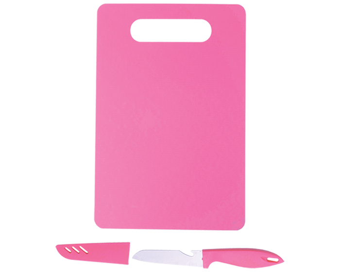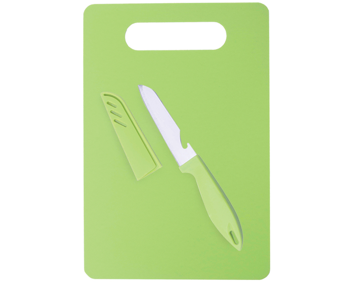 Tabla para picar y cuchillo de cocina con destapador; mango de plastico y funda perfecta del mismo color.