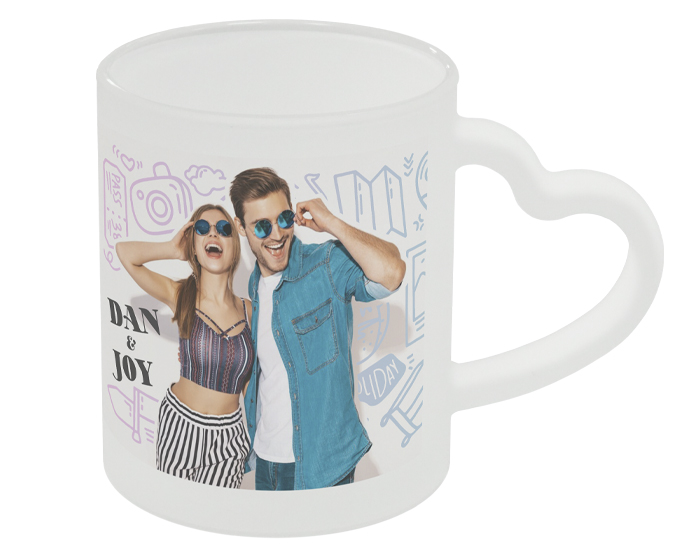 Taza de vidrio satinado para sublimación con asa en forma de corazón. CAP. 340 ml. (10 OZ.) Venta en múltiplos de 12.