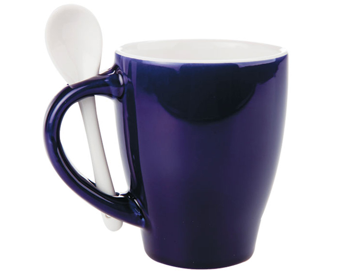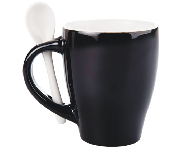 Taza con cuchara bicolor. CAP: 12 OZ. Incluye caja por pza.