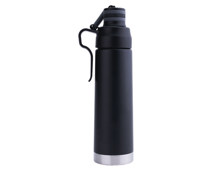 Termo de acero inoxidable con acabado en esmalte negro, con práctica asa metálica para sujetarlo fácilmente o para colgar en la mochila. Cuenta con boquilla para tomar cómodamente las bebidas y con tapa de rosca amplia para vaciar liquidos fácilmente. El diseño tiene detalles decorativos con banda y