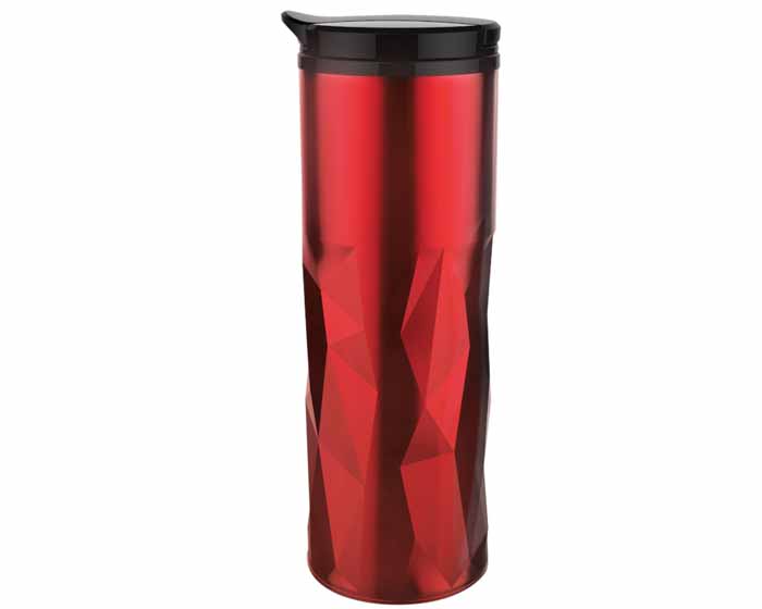 Termo metálico con interior plástico, tapa enroscable hermetica, boquilla y tapa abatible con seguro. CAP. 470 ml.
