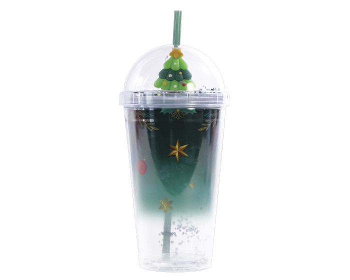 Vaso de plástico de doble pared con diseño navideño y lentejuela en su interior. Cuenta con tapa de cúpula con figura de Árbol de Navidad con lentejuelas y popote. CAP. 500 ml. Presentación: caja de regalo de color. BPA FREE.