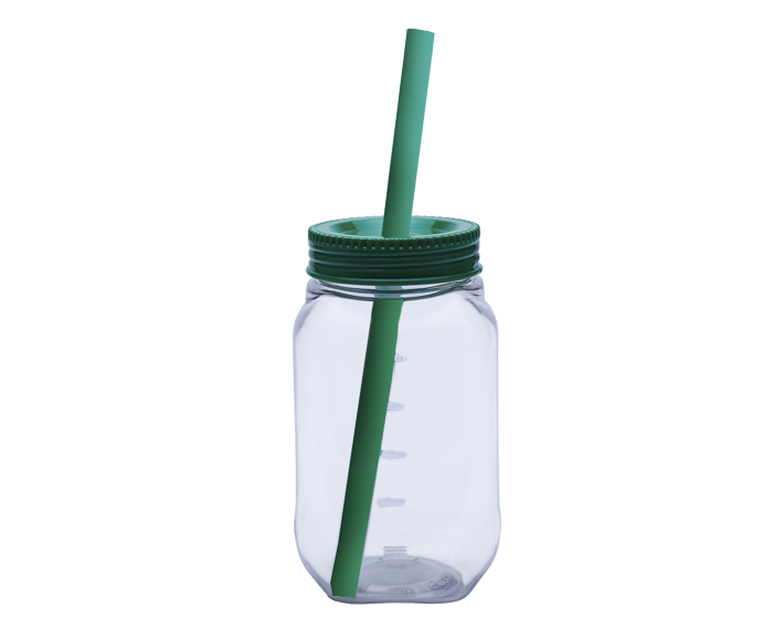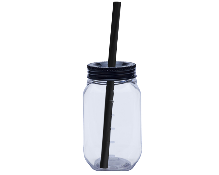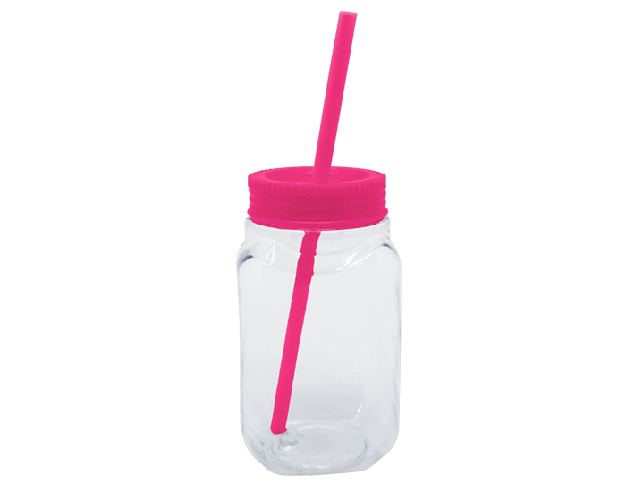 Vaso de plástico cuadrado transparente con tapa de rosca en color. Incluye popote rigido bicolor. CAP. 600 ML