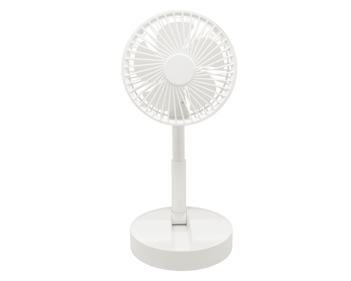 Ventilador plegable ideal para interior o exterior. Cuenta con botón de encendido, presiona el botón y cambia la velocidad del aire en 3 diferentes intensidades. Cuerpo plegable que permite el movimiento del ventilador para ajustar la dirección del aire. Recarga mediante conexión USB, es plegable y ligero para que puedas llevarlo o guardarlo fácilmente. Incluye cable de carga. Presentación: caja en color blanco.