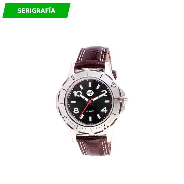 Reloj con caja metálica, dial grabado en arillo giratorio y correa de piel. Incluye estuche metálico.