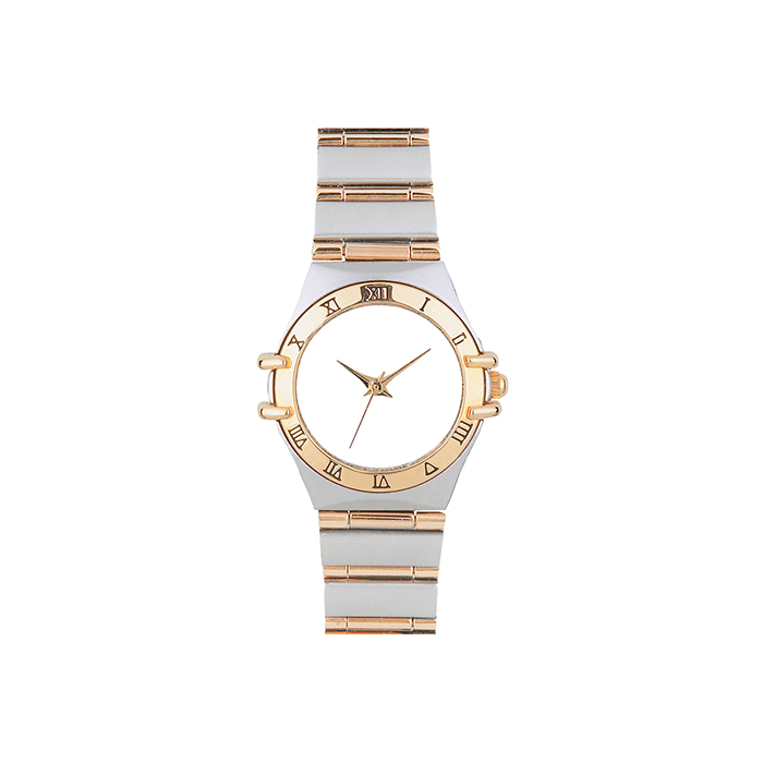 Reloj metálico bi-tono, números romanos grabados en el bisel y maquinaria metálica japonesa. Incluye estuche metálico individual.