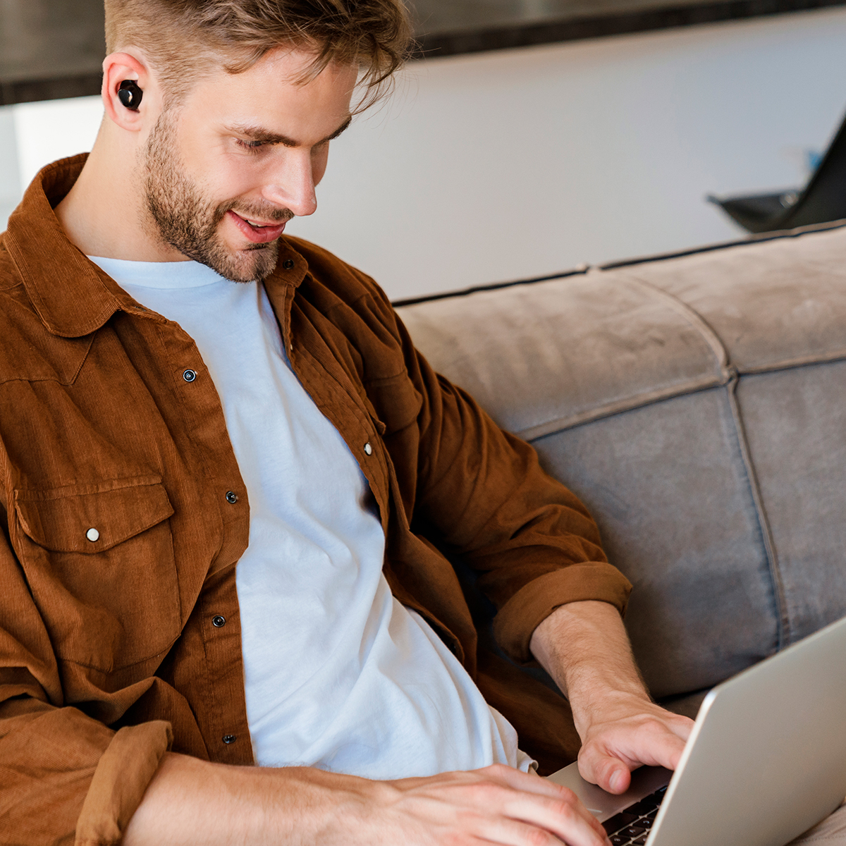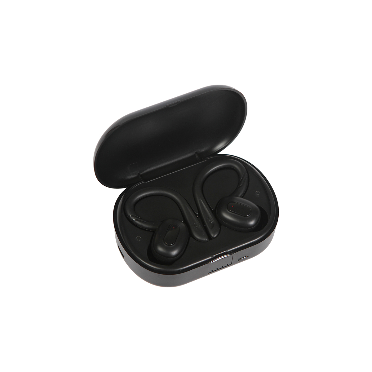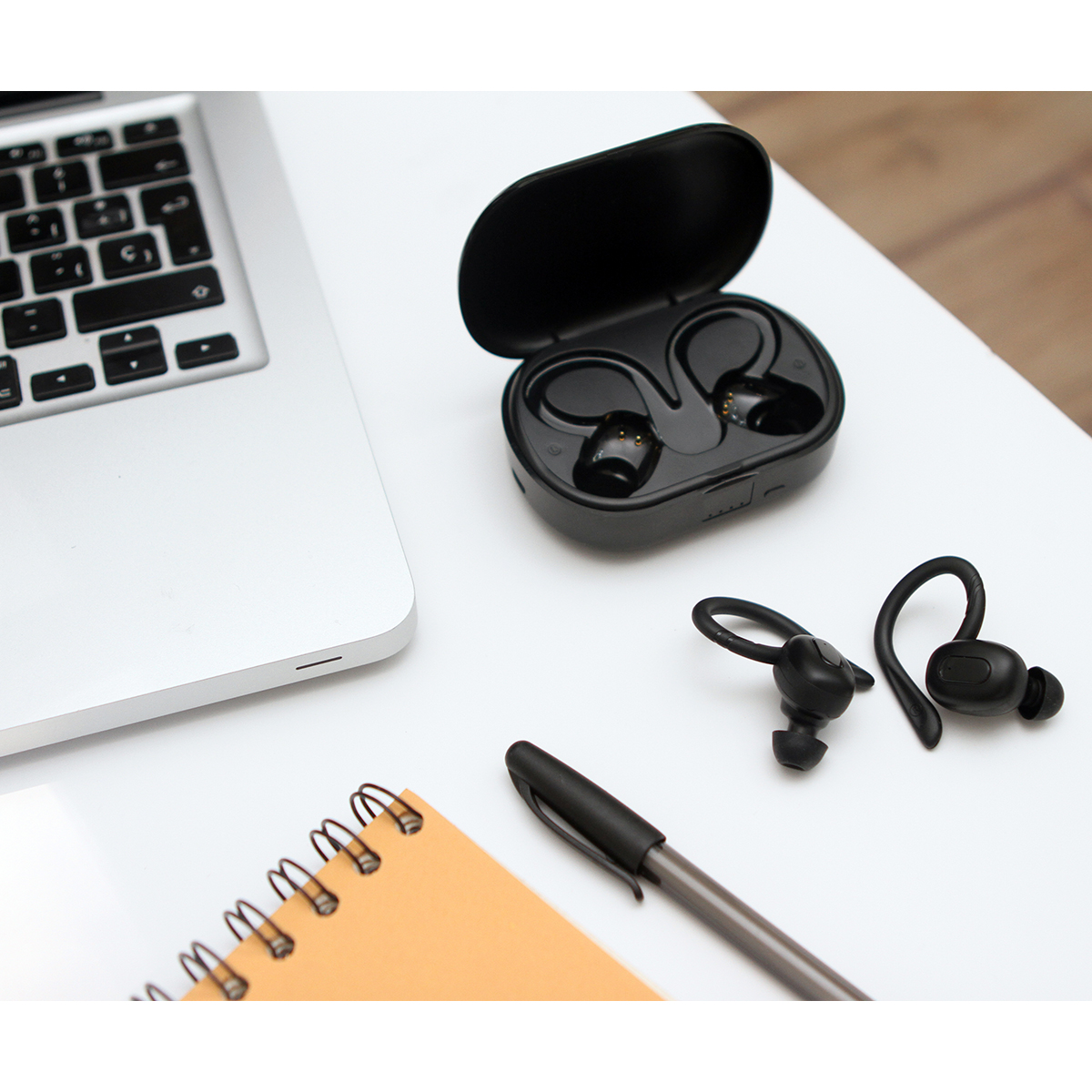 Audífonos bluetooth fabricados en plástico ABS con gancho anti caída de silicón y estuche de plástico. Incluye cable para carga USB y caja de cartón individual.