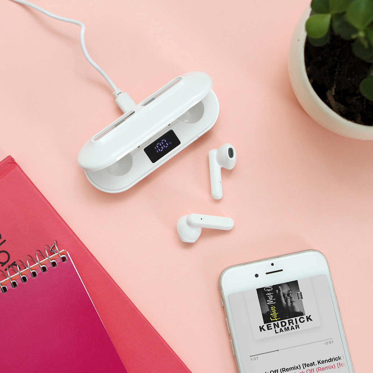 Audífonos bluetooth con función touch, estuche de carga fabricado en plástico ABS, tiempo de reproducción de música de 3 a 4 horas. Carga a través de cable USB (incluido). Incluye caja de cartón individual.