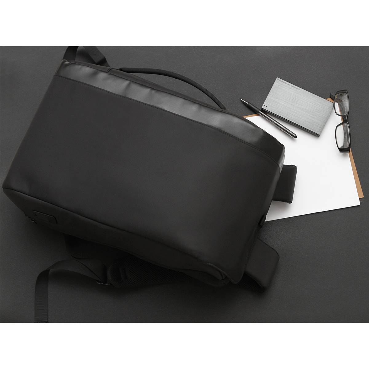 Backpack fabricada en material repelente al agua, con salida para carga USB, compartimento para laptop o tableta inteligente, tirantes acolchonados ajustables, asa lateral y cinta trasera para fácil transportación.
