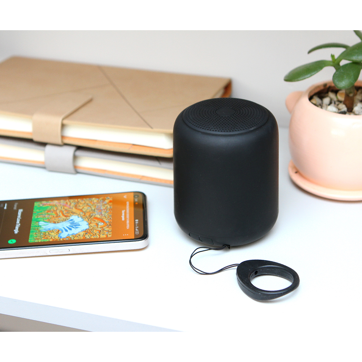 Bocina inalámbrica portátil fabricada en plástico ABS con acabado suave al tacto tipo goma. Cuenta con una frecuencia de 20KHz. El tiempo de carga es de 2 a 3 horas, resistente al agua con puerto de carga tipo C, tiempo de trabajo de 3.5 a 4.5 horas.