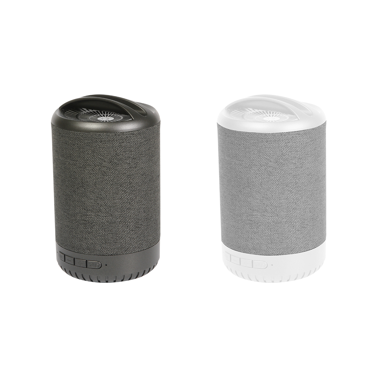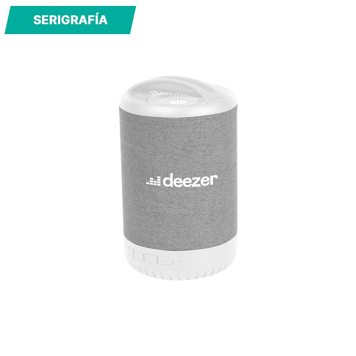Bocina bluetooth con radio FM, entrada para tarjeta TF y memoria USB, fabricada en plástico ABS con cubierta de tela y soporte para celular en la parte superior, carga a través de cable USB (incluido). Incluye caja de cartón individual.