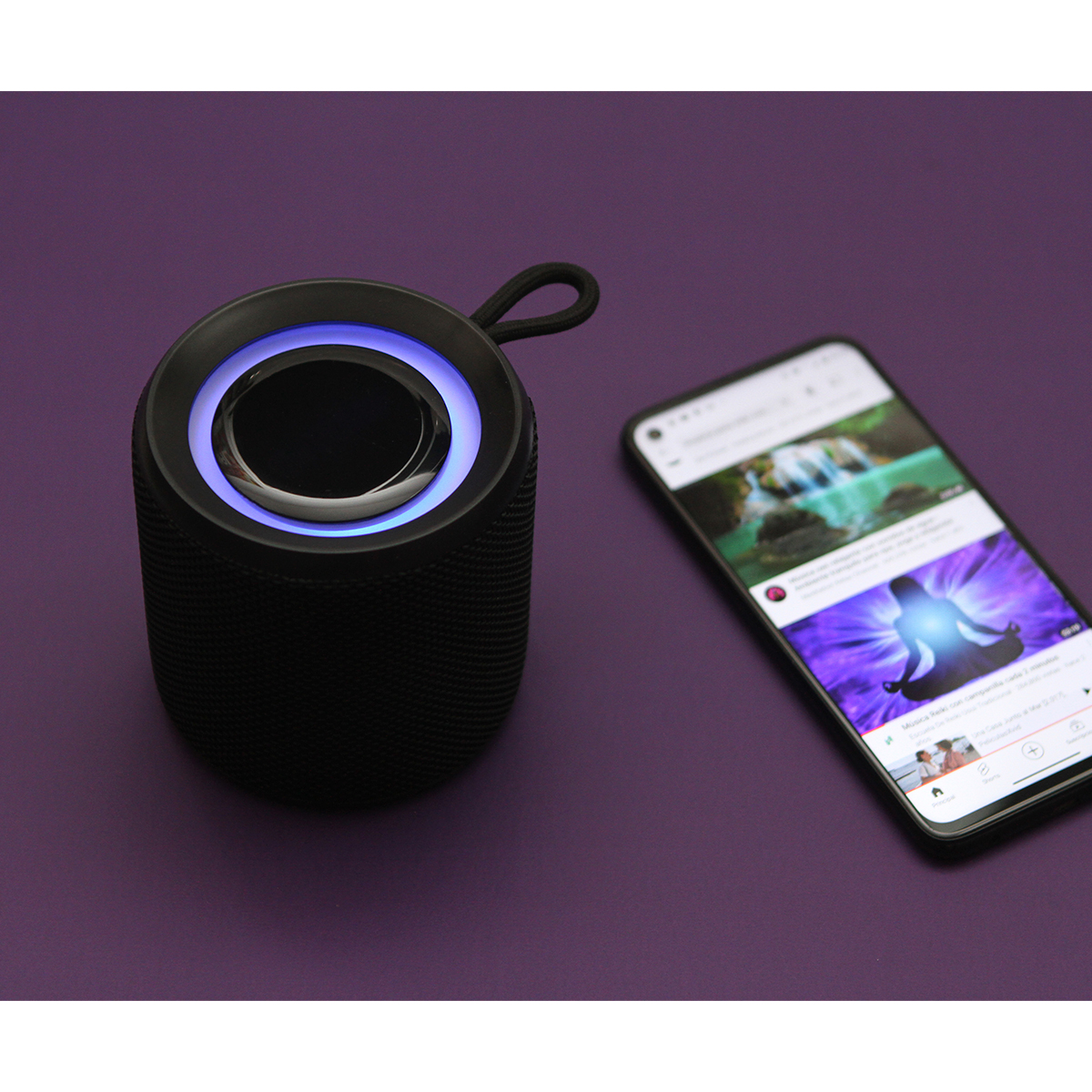 Bocina Bluetooth a prueba de agua fabricada en plástico ABS y metal, con cubierta de tela, acabado mate, cordón e iluminación led en la parte superior. Incluye cable de carga USB y caja de cartón individual.