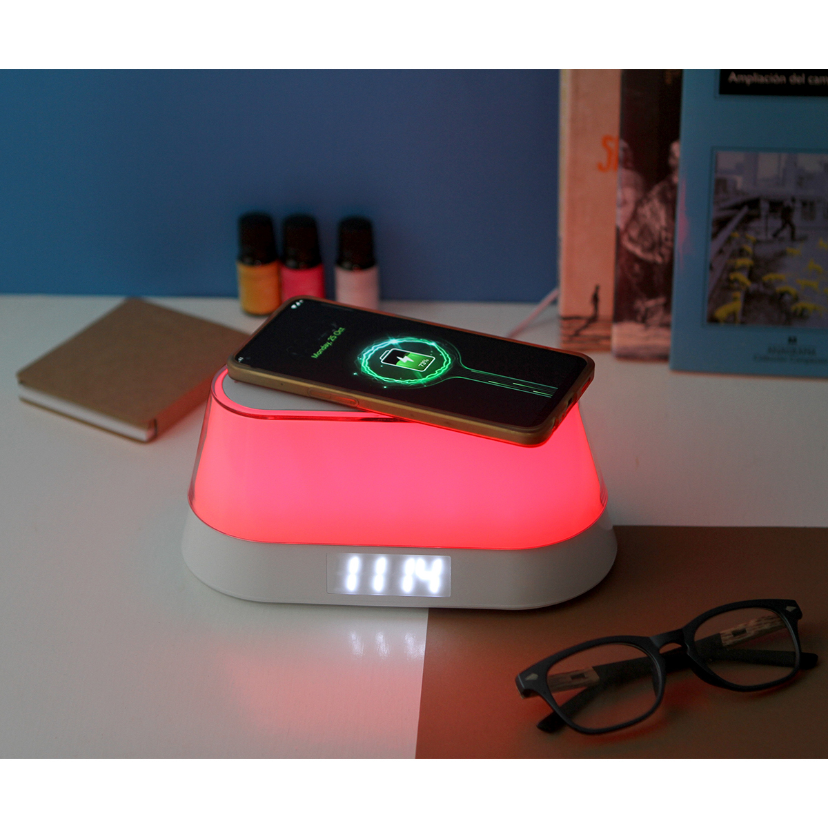 Bocina multifunción de plástico con lámpara LED con efectos de colores, funciones de alarma y cargador inalámbrico. Potencia de altavoz de 3W, potencia de carga de hasta 15W.