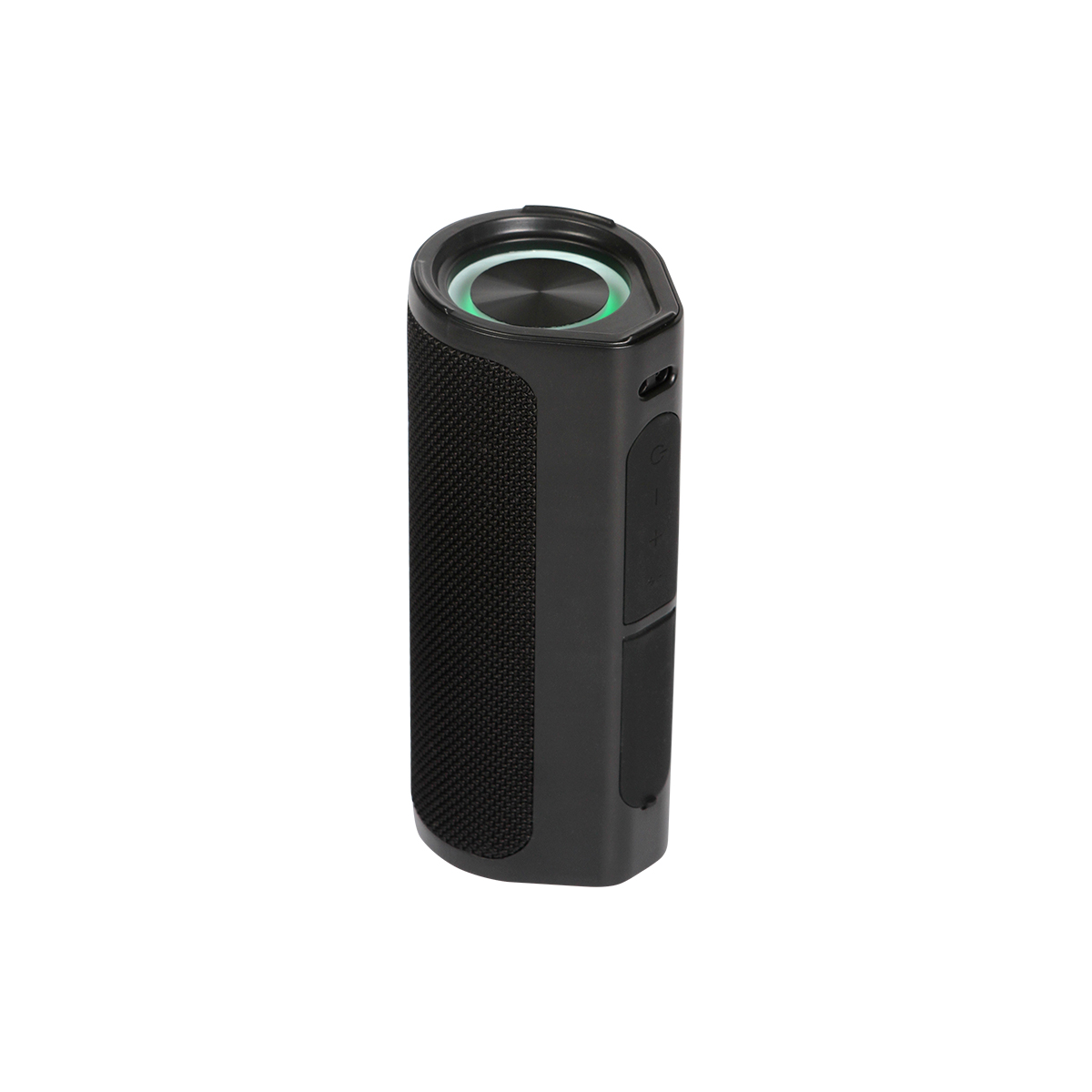 Bocina Bluetooth con radio FM y entrada para tarjeta TF, fabricada en ABS, silicón y tela. Con iluminación en la parte superior. Carga a través de cable USB (incluido). Incluye caja de cartón individual.