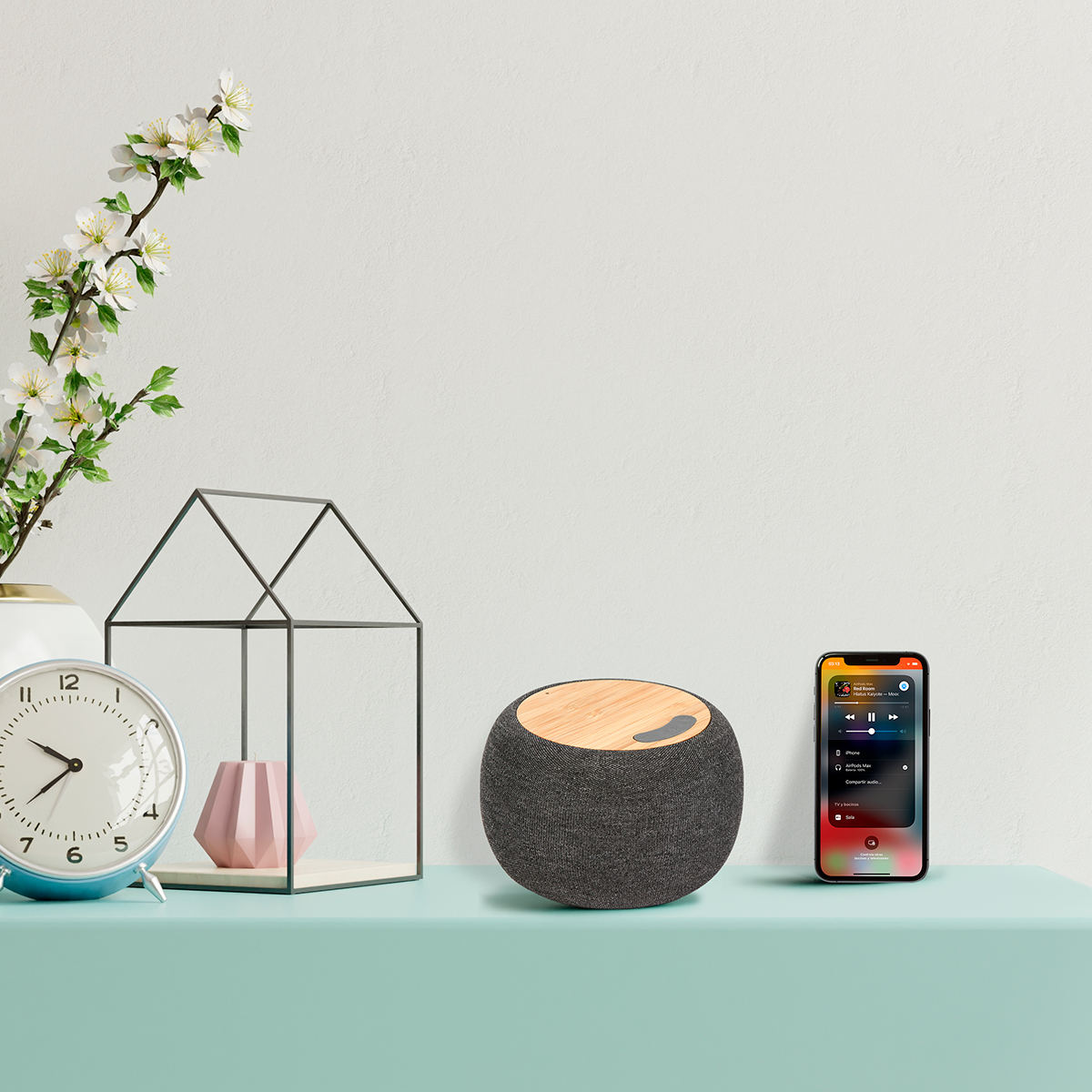 Bocina Bluetooth forrada en tela, con bambú en la parte superior; con cargador inalámbrico. Carga a través de cable USB (incluido). Incluye caja de cartón individual.