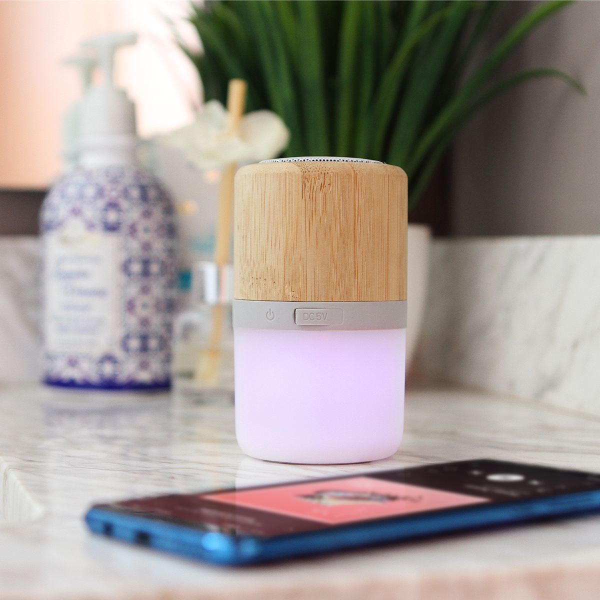 Bocina inalámbrica con lámpara y detalle de bambú, con función bluetooth y carga a través de cable usb (incluido). Incluye caja individual de cartón.