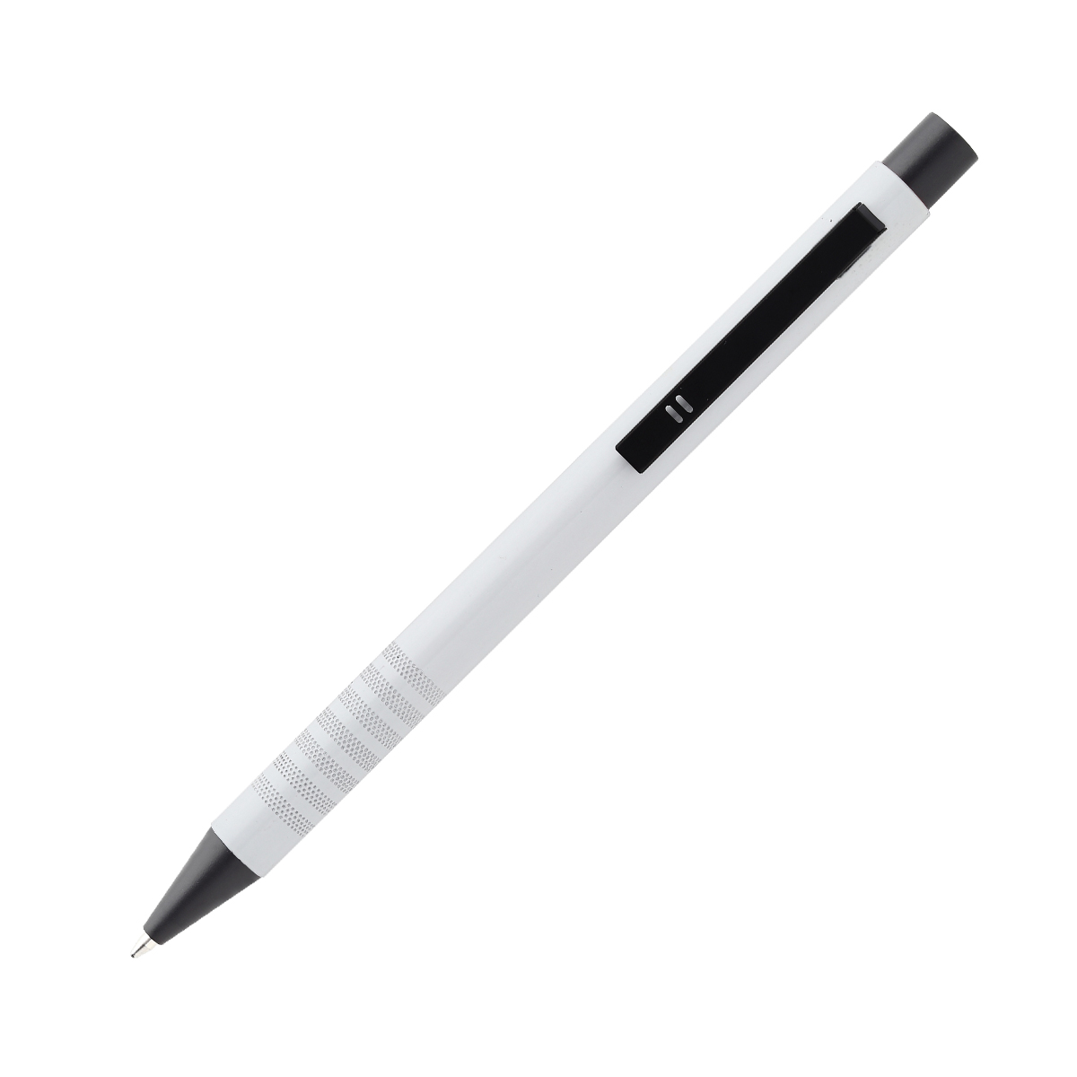 Bolígrafo con barril de aluminio acabado brillante, botón de plástico y clip metálico. Tinta de escritura azul.