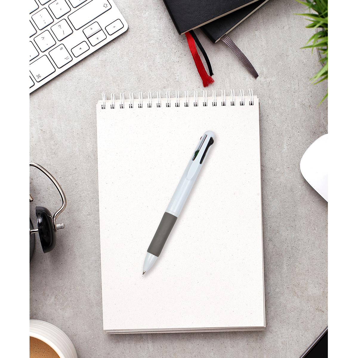 Bolígrafo 4 en 1, con barril de plástico ABS y grip suave, 4 colores de escritura (azul, negro, rojo, verde).