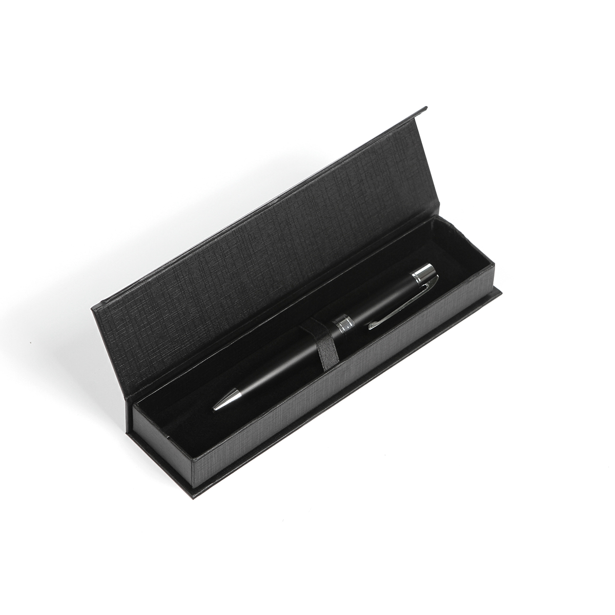 Bolígrafo metálico con detalles cromados en punta y clip, tinta de escritura negra. Incluye estuche individual.