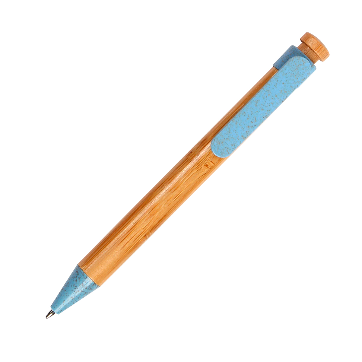 Bolígrafo de bambú, punta y clip en plástico reciclado y de color, tinta de escritura azul.