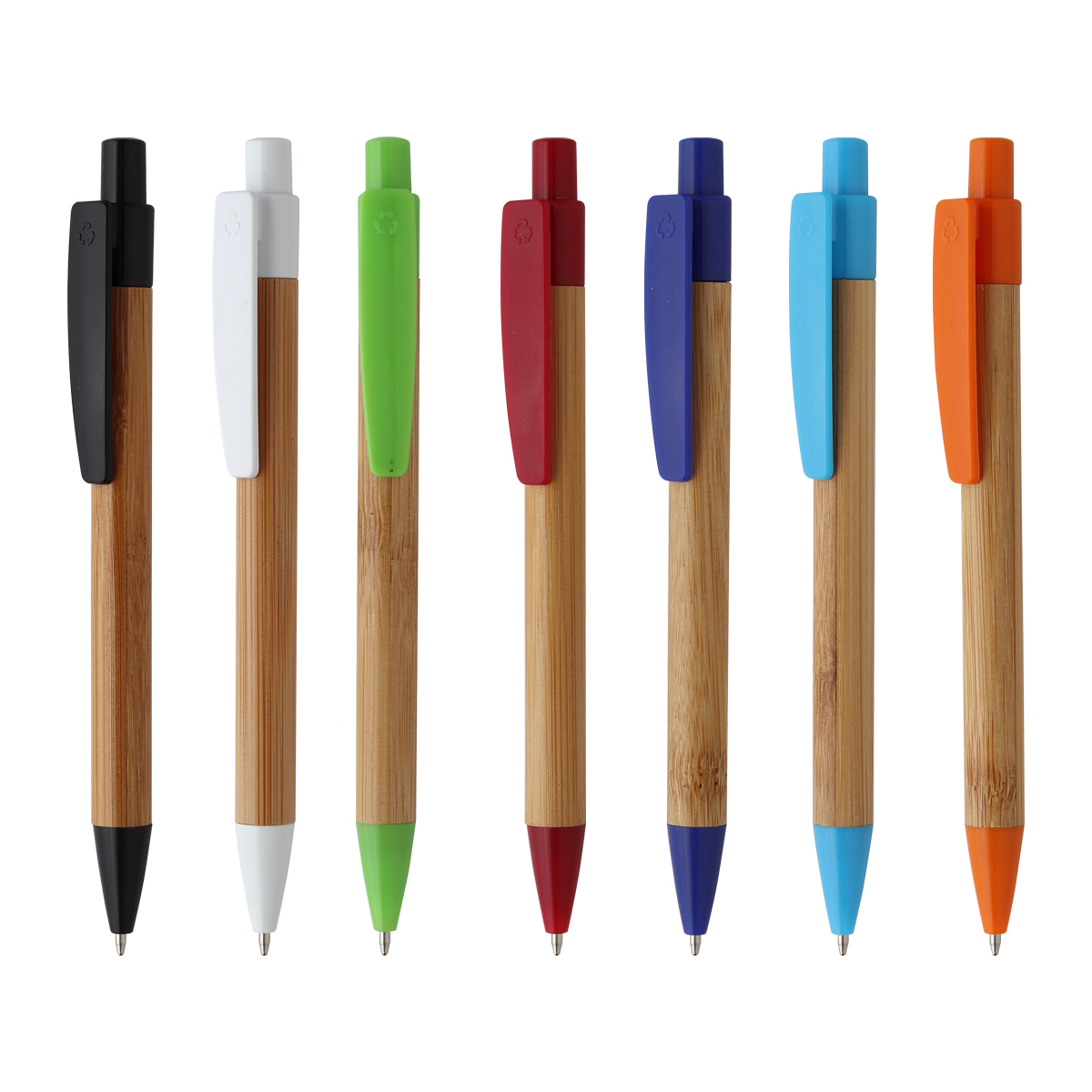 Bolígrafo retráctil fabricado en bambú con punta y clip de plástico en color, tinta de escritura negra.