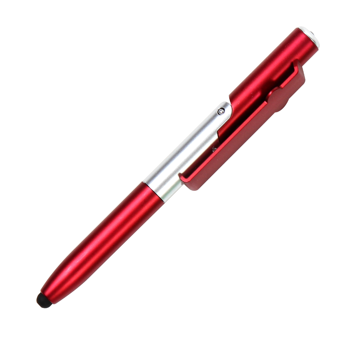 Bolígrafo de plástico con lámpara, puntero touch y diseño base para celular con tinta negra.