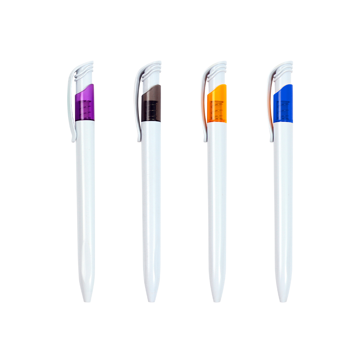 Bolígrafo de plástico retráctil, con detalles de color y tinta de escritura negra.