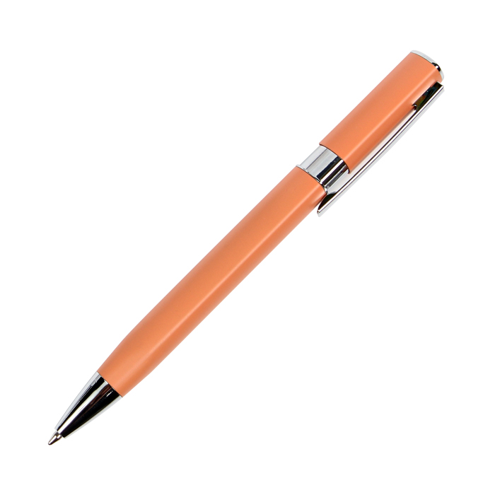 Bolígrafo retráctil fabricado en aluminio con forma triangular, clip, punta y detalles cromados, tinta de escritura negra.
