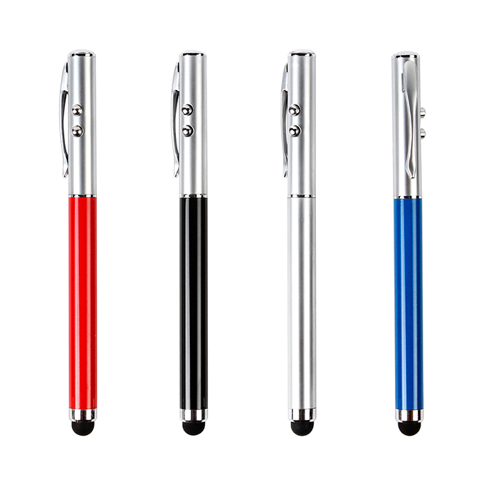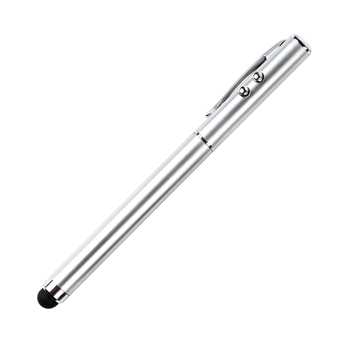 Bolígrafo metálico multifunciones, luz led, señalador láser, puntero touch y tinta negra. Incluye estuche individual.