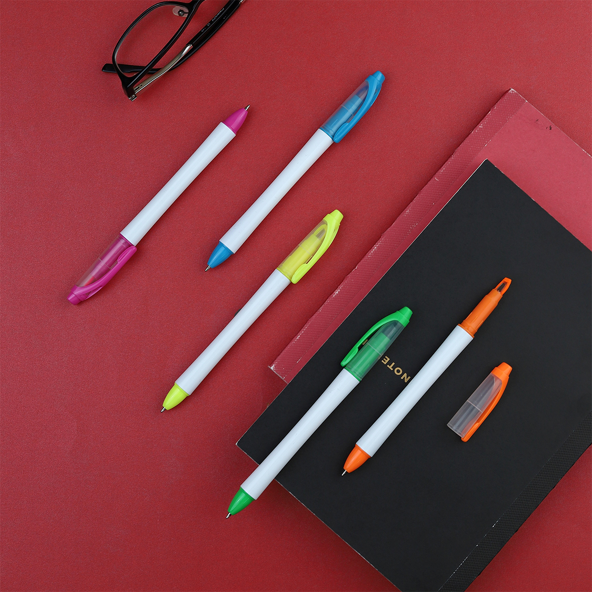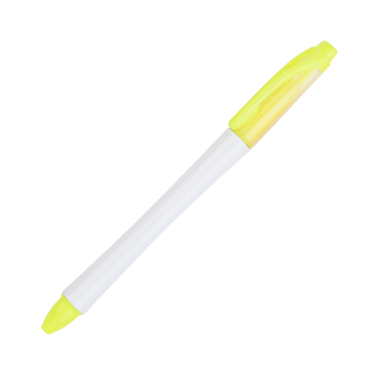 Bolígrafo 2 en 1 con marca textos; barril plástico color blanco, tapa en la parte superior translucida con detalles de color en clip y punta. Tinta de escritura negra.