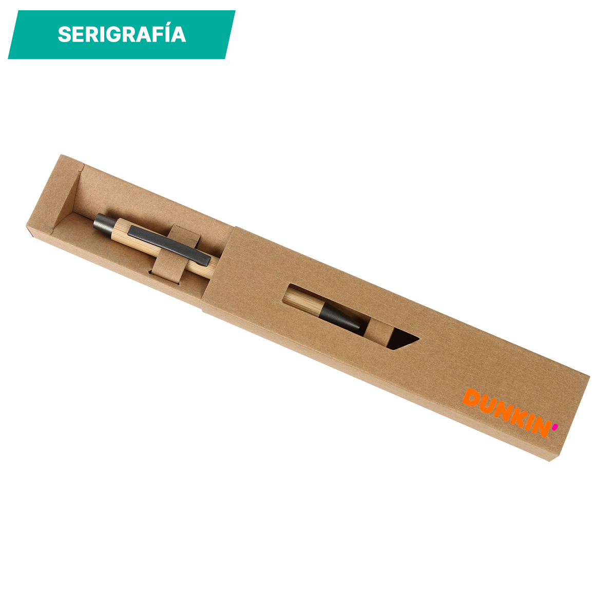Bolígrafo con barril de bambú y detalles metálicos en clip y punta, tinta de escritura negra. Incluye estuche de cartón individual.