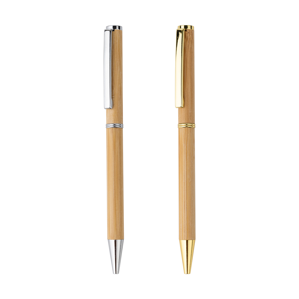 Bolígrafo con barril de bambú y detalles en metal cromado, tinta de escritura azul. Incluye estuche de cartón individual.