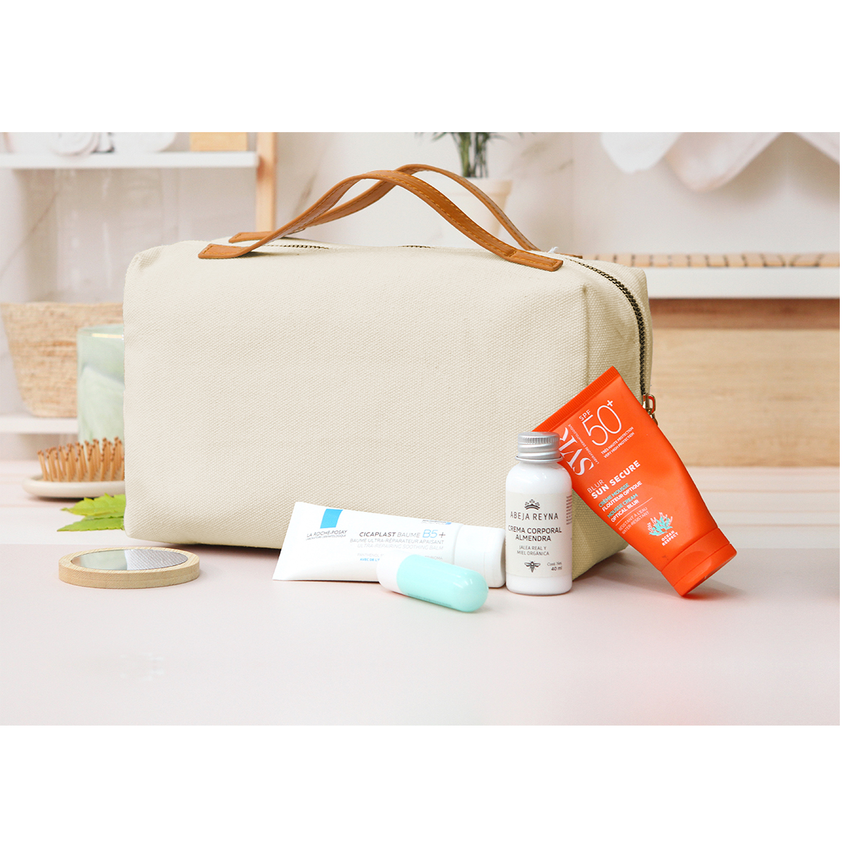 Bolsa tipo cosmetiquera fabricada en algodón tipo canvas caracterizado por su resistencia. Tiene un forro 100% poliéster con un compartimento principal con cierre, dos asas, con detalles fabricados en PU, también conocido como curpiel. Es un accesorio práctico y elegante que ayuda a organizar y transportar los productos de belleza de manera cómoda y segura.