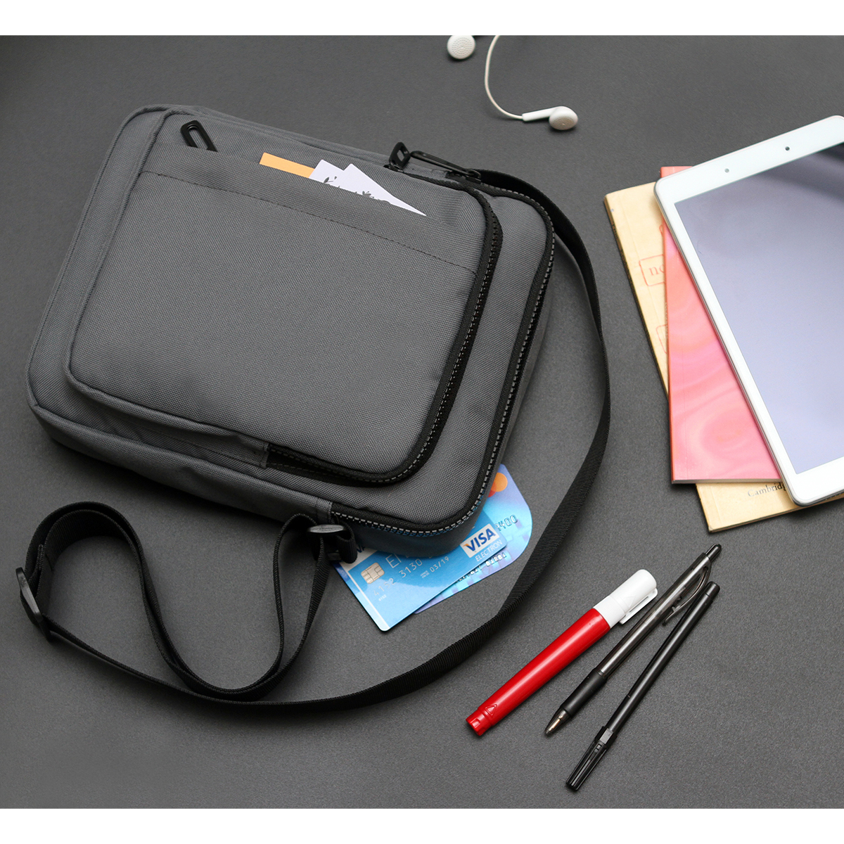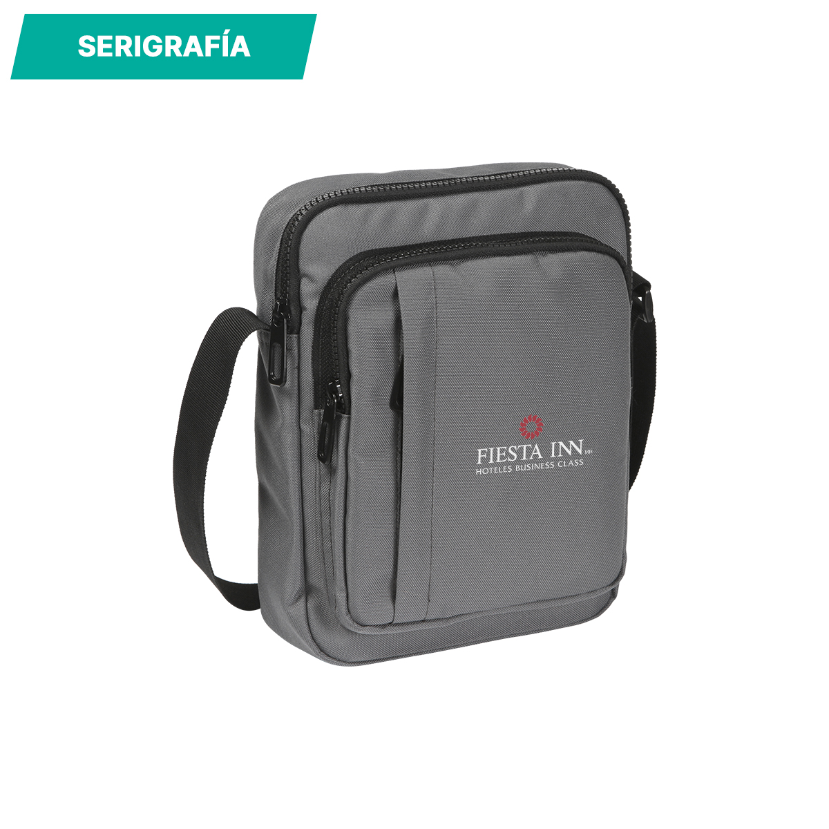 Bolsa multiusos fabricada en poliéster reciclado a prueba de agua, con bolsillo frontal con cierre, dos compartimentos y correa ajustable.