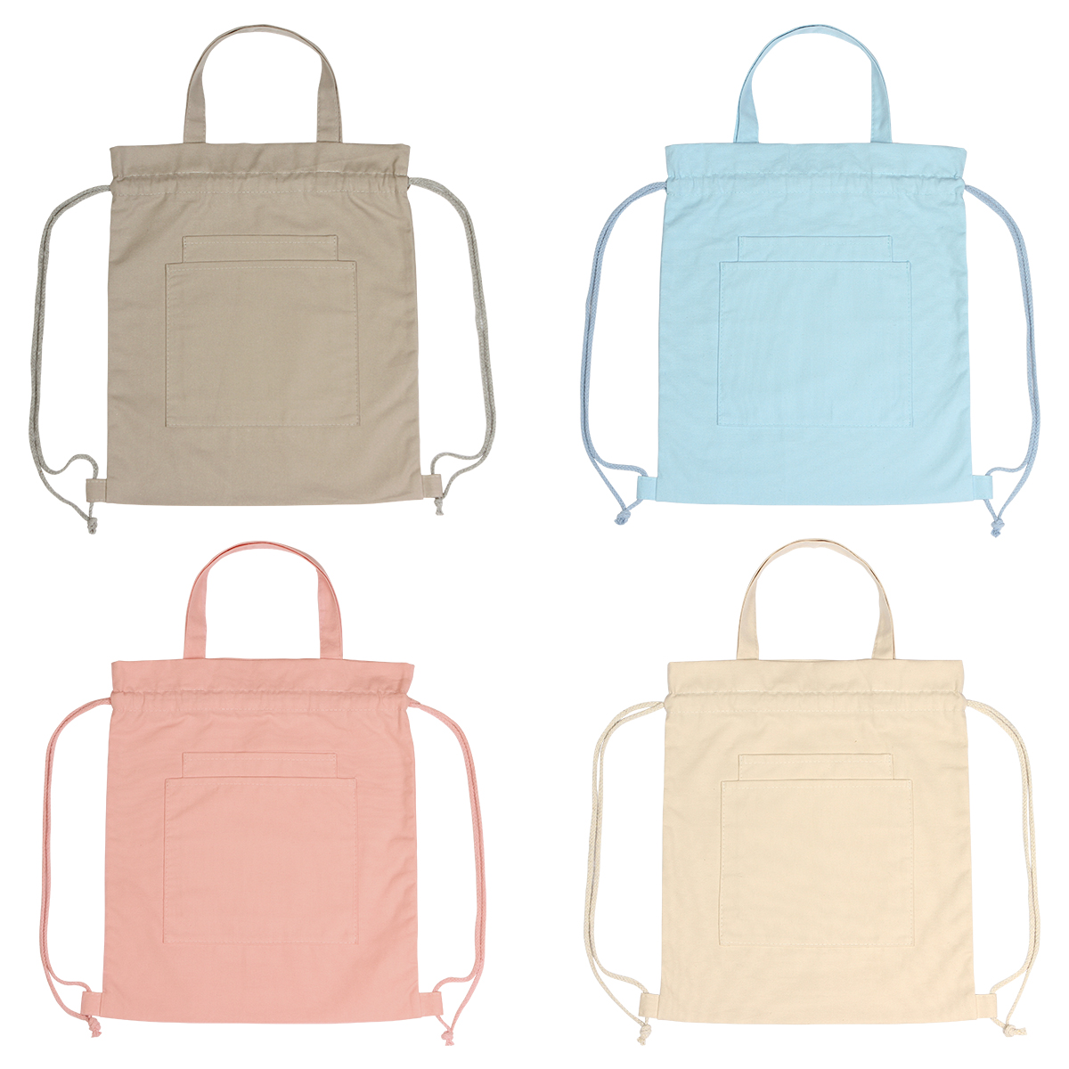 Bolsa de algodón de 10 onzas, con bolsillo frontal, asas superiores y cordón para cierre tipo jareta.