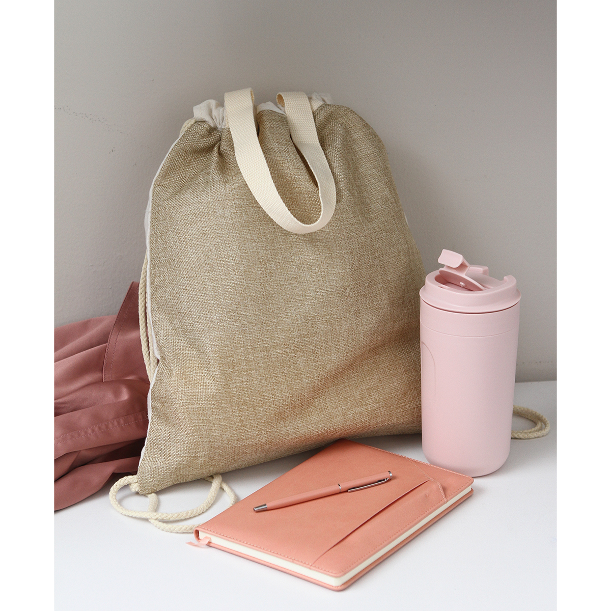 Bolsa morral fabricada en algodón 10A y yute imitación (poliéster). Cuenta con corres laterales para llevar como mochila, y correas superiores para cargar como bolsa.