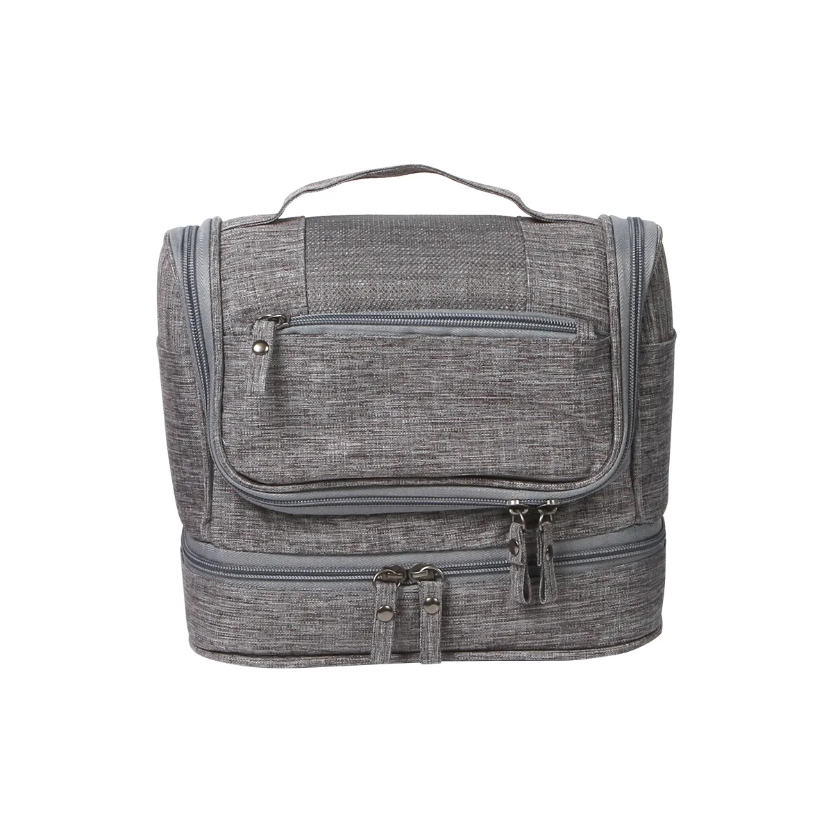 Bolsa multiusos doble / neceser / cosmetiquera fabricada en poliéster, con compartimiento en la parte frontal, bolsillo en la parte inferior, asa en la parte superior de la bolsa, 2 compartimientos en los laterales, múltiples compartimientos en la parte interior. Incluye un gancho en el interior de la bolsa para colgarla.