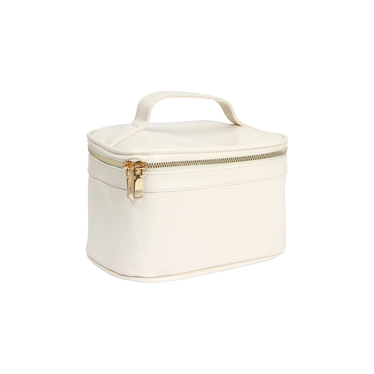 Bolsa tipo cosmetiquera fabricada en curpiel y forro interno de poliéster. Cuenta con un sólo compartimento principal, con cierre de metal y agarradera en la parte superior para facilitar su manipulación. En la parte interna cuenta con una bolsa vertical sin cierre, y en la parte de la tapa con una bolsa hecha de tela tipo mesh con cierre de metal. Es un accesorio práctico y elegante que ayuda a organizar y transportar los productos de belleza de manera cómoda y segura.