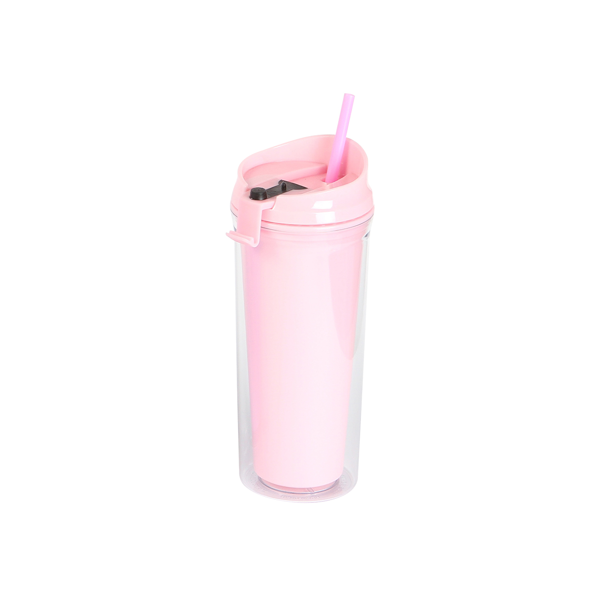 Botella doble pared con cuerpo y tapa fabricado en acrilonitrilo estireno (AS). Incluye popote fabricado en poliestireno (PS). Capacidad de 690 ml. Con pared transparente externa y pared interior a color.